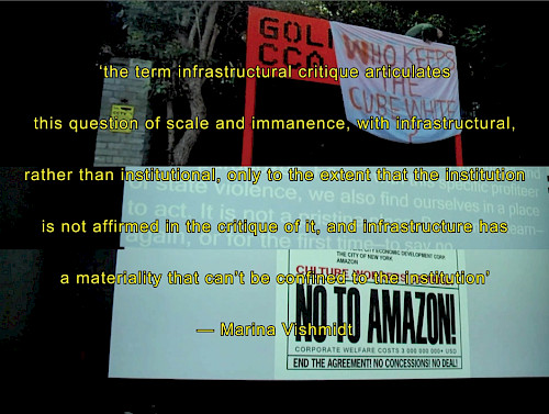 « The conference What is Infrastructural Critique? will feature artists, critical theorists and collaborators with Marina, who will come together to think through Marina’s concept of infrastructural critique, a materialist approach to the infrastructures of contemporary art oriented towards aesthetics and political struggle in all of its interconnected modes and scales. »