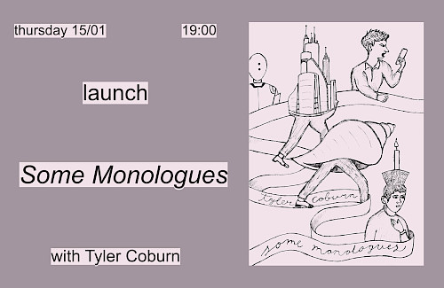 Join us for the release of Some Monologues by Tyler Coburn, a publication that gathers fifteen years of the artist’s scripts (Wendy’s Subway, 2025). On this occasion, Coburn presents a new monologue entitled People that draws influence from A Personal History of American Theatre (1980), a one-person performance by the American actor and writer Spalding Gray (1941–2004). After performing People, Coburn will be joined in conversation with artist Eoghan Ryan.