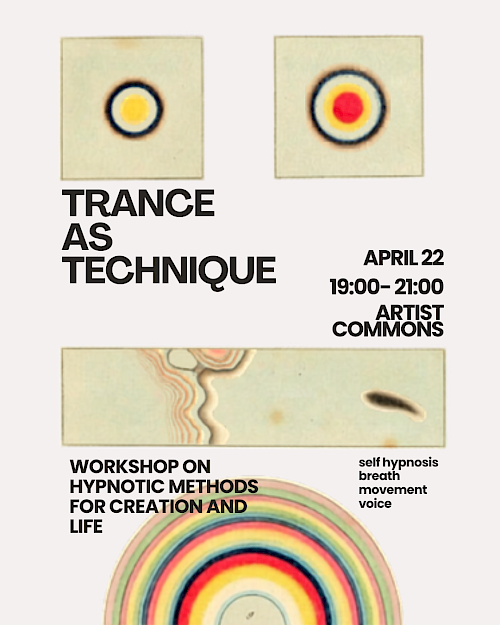 Trance as Technique is a collective exploration of hypnosis as both an artistic and somatic practice. Through guided visualization, breath work, subtle movement, vocal practice and embodied exercises, participants are invited to enter altered states of perception where imagination and sensation intertwine.