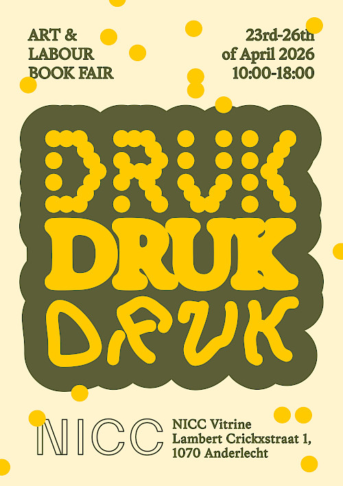 NICC introduces DRUKDRUKDRUK, an art book fair that gathers essays, zines and independent publications on the theme of Art and Labour. It questions how printed matter can play a crucial role in exhibiting the working conditions reality and infrastructuresfuture of artists and art workers.